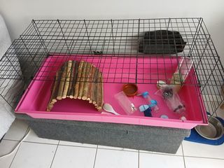 Cage 1m par 50 cm rose bon etat avec cabane bois ,parc interieur avec notice,differents tapis de sol,jouets,biberons abreuvoir, plat,foin, cereales,gateaux,peigne,brosse,plus parc