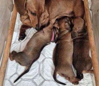 Nous vous proposons une portée de petite femelle teckel à poil ras standard de couleur fauve, nés le 12 janvier 2026, issue du mariage de N'AIM des dunes de bou saada champion inte