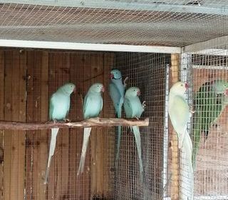 Je vends 2 colliers d'Asie bleu nés en 2025 élevés par les parents en volière extérieur, ils ne sont pas sexés. Ce sont ceux sur le perchoir.