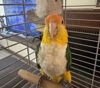 Capacitaire cède à ayant droit ( capacitaire ou autorisation de détention) 3 ara Chloroptere x Ararauna (ara harlequin) de 5 mois élèvés à la main, sevrés, propre élevage, bagués.