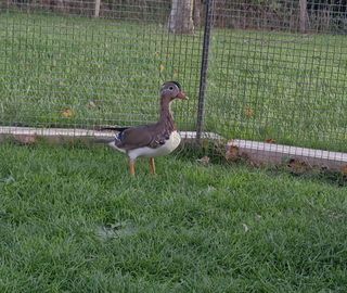 Jeune canard mandarin male qui prend ses couleurs. Il est né en juin et est volant, non ejointé.