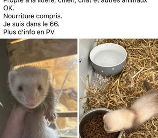 Bonjour, voici Roxy une Furette âgée de 3 mois, née le 20 juillet 2025. Elle est très sociable et aime beaucoup jouer. Propre à litière, chiens, chats et autres animaux OK. Nour