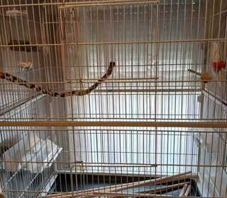 Cage volière pour oiseaux (perruches, canaris etc) avec roulettes. Une étagère au dessous. Assemblage de deux cages, permettant de créer une séparation. Hauteur : totale 227 cm