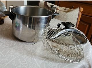 Cocotte minute SEB 8 litres avec panier vapeur. Diamètre 26 cm. Livre recettes. Le fond extérieur est un peu abimé. Non compatible induction