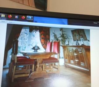 Vends une salle à manger en chêne et de style,une amphilade,une table rectangulaire,4 larges chaises tissu velours bordeaux,un cantou qui fait coffre,et un lustre gothique à 2 étag