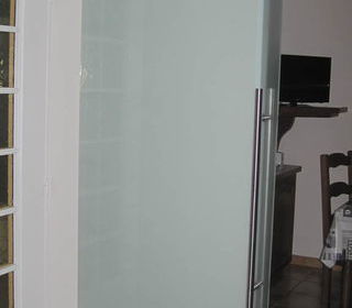 Porte coulissante en verre dépoli montée sur un rail métallique, équipée d'une grande poignée verticale en métal.