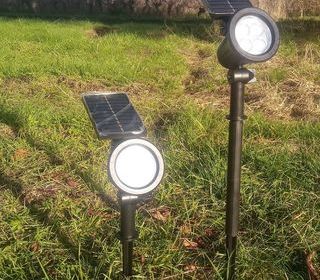 Piquets solaires a Led autonome. Marche a l'Energie solaire. Spot d'éclairage extérieur amovible. Aluminium et pvc. Dimensions sur photo. Puissance : 1,6 watts Etanche IP65. Dé
