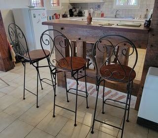 Lot de trois chaises hautes avec assise en bois et structure en fer forgé noir, dossier avec motifs décoratifs en fer forgé. Bon état général, idéales pour un bar ou un îlot de cui