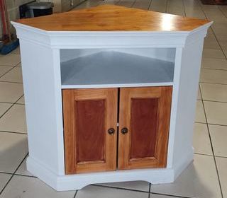 Meuble d'angle télé 68 x 68 Hauteur : 82 cm Bois blanc et marron Bon état Voir pour livraison.