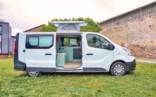 Renault Trafic L2H1 Equipements Intérieurs : Toit levable type champignon TR31 de chez JCG Lit peigne 120×190 avec coffres de rangement; Jerricans sous évier avec 19L d'eau propre