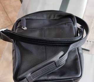 En cuir de vachette. Anse plate. 2 poches extérieures, une zippée et une plaquée. Poche externe zippée au dos. Poche externe à l'avant contenant un emplacement pour téléphone porta