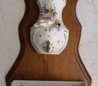 Fontaine murale en faïence peinte Moustiers-Sainte-Marie. Artisan Mathieu J. En parfait état comme neuve exceptionnel. Hauteur totale 70cm, largeur 40cm, Profondeur 20cm.