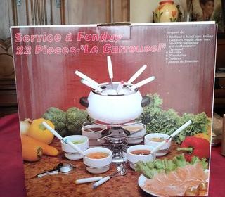 Vends+service+à +fondue+22+pièces+neuf+jamais+servi+composé+de+:+1+réchaud+à +alcool+avec+brà"leur,+1+caquelon+émaillé+blanc+avec+couvercle+séparateur+anti-éclaboussures,+1+carrous