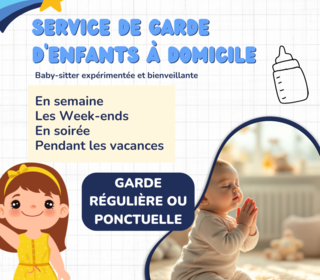 Bonjour, Baby-sitter expérimentée propose ses services de baby-sitting pour enfants à domicile. En journée / le soir / les week-end ou pendant les vacances. Je m'adapte à vo