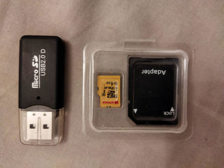 Je vends un lot comprenant une carte SD de marque Kodak ( neuve ) de 64 Go, un adaptateur pour carte SD, et une clé USB 2.0 pour cet adaptateur. - Type d'accessoire : Carte SD, Ad