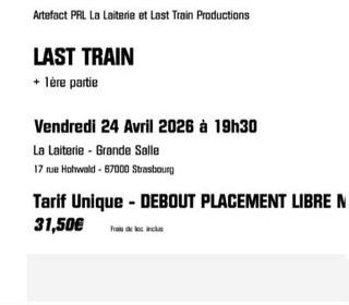 Bonjour, Suite à un départ en vacances de dernière minute je revends trois places pour assister au concert sold out de Last Train à La Laiterie, Strasbourg.