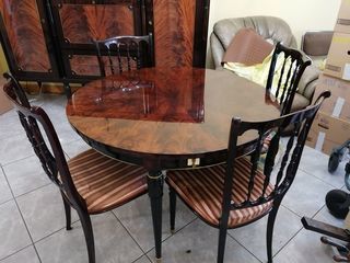 salle à manger regency comprenant un buffet haut 1.52 m x 2.02 m avec vitrine et ouverture bar une table ronde diamètre 1.10 m et 4 chaises d'époque 1960 2 rallonges pour la ta