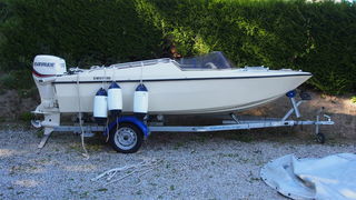 Bateau Manta Prestige Rocca longueur 4,5 m largeur 2 m. Moteur Evinrude E.Tec 75 cv année 2018 blanc 2 temps injection directe 30 heures de navigation. Remorque SUN WAY Modèle Gal