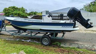 Bateau Boum 415 avec remorque ,2 moteurs TOHATSU 9,9,4 temps ,arbre long dont 1 avec mise en route démarrage électrique et volant sur le bateau, le 2 très peu servi 5 ou 6 heures d