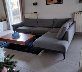 Canapé d'angle en parfait état. longueur 2m95 + méridienne 2m15. Tissus gris-bleu. Coussins dorsaux indépendants en plumes. voir facture et le plan pour les détails. Le divan est