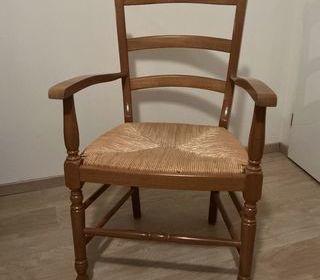 Large fauteuil en bois massif avec accoudoirs et haut dossier. Pieds de devant tournés, assise paillée en très bon état . Plus grande largeur devant 55 cm, et 49 cm au niveau du