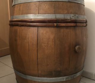 Fût tonneau barrique en chêne dimensions : - hauteur : 88 cm - diamètre (au-dessus) : 64 cm - diamètre (au milieu) : ca. 75 cm