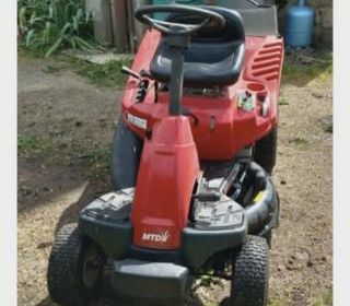 Tondeuse autoportée de couleur rouge, équipée d?un volant, d?un siège et de quatre roues. Présence d?un bac de ramassage à l?arrière. Marque MTD visible sur la partie avant. Convie
