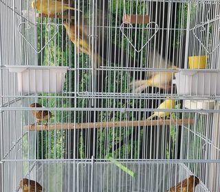 À vendre canari jaune en très bonne santé, actif et agréable à observer. Sexe non déterminé. Vendu avec une cage modulable pouvant être séparée en deux compartiments, équipée de