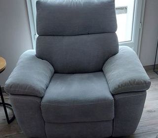 Vends fauteuil relax électrique gris clair. Revêtement tissu microfibre 100 % polyester. Un moteur 29 volts. L : 111 - H : 100 - P : 95. Bon état.
