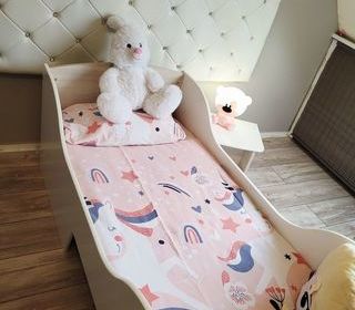 Lit enfant mixte en 140x70 cm, moderne type bateau blanc et beige accompagné de son sommier lattes en bois ainsi qu'un tiroir de rangement sur roulettes de belle dimensions et de