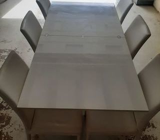 Table salle à manger modulable 180 x 90 ou 90 x 90 6 chaises blanche simili cuir blanc avec housse de protection rouge