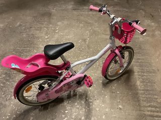 Vélo 16 pouces,état neuf de couleur rose et blanc.Peu servi du fait que ma petite fille n'habite pas notre région.Vélo ayant une béquille.pneus neufs.