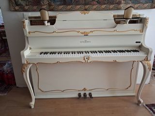 Piano droit magnifique en bois sculpté blanc avec dorures couleur or et ses 2 pieds splendides ainsi que ses 2 lampes rétractables de la prestigieuse marque Schimmel . Caisse de ré
