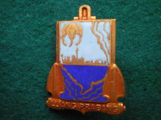 Un écu allongé traversé par une épée avec deux canons croisés le tout doré. Au centre de l'écu les lettres NBC et le chiffre 601. Fabrication sans marque. Livraison La Poste en let