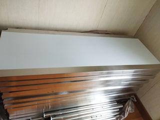 vends trois étagères en inox ,toutes neuves jamais montées ,toujours le film protecteur dessus ...de 5 étages chacune ...dimension 1 mettre 25 de long et de épaisseur 4 cm marque V