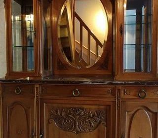 Buffet trois portes et tiroirs sculptés en partie basse, et en partie haute, deux vitrines latérales à verres biseautés avec étagères en verre, et entre les deux, un miroir ovale,