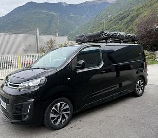 Vend Citroën jumpy 2l 150cv full black, jantes aluminium, boîte manuelle 6 vitesses. Tente de toit XL vevor 3 personnes. Petit aménagement intérieur : isolation, habillage lambri