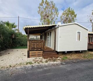 Vente d'un Mobil home de 2018 cosy et fonctionnel vendu avec terrasse et climatisation , 32M2 2 chambres 1 salle de bain au camping les sables du midi à Valras Plage Idéal premi