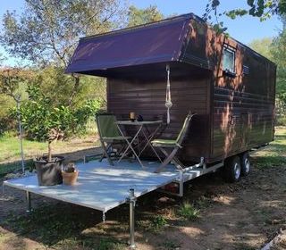 Tiny avec grande terasse abritée de n partie et dépliable. Installation solaire autonome réalisé par un électricien (2 panneaux 250watt, 1batterie x ampères, 1convertisseur victro
