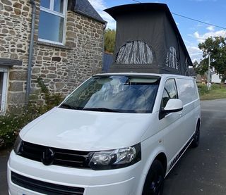 Très beau van aménagé transporter T5 jantes noires vw Belle peinture blanche et noire. Tablette de tableau de bord+ kit main libre. Attache remorque Porte vélos 4 places Aména
