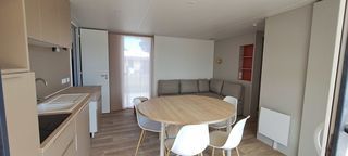Superbe mobilhome de 40m2 idéalement situé entre l'accueil et l'aqua park. 3 chambres, 2 salles de bains entièrement équipé pour accueillir 6 à 8 personnes. Cuisine avec taques au