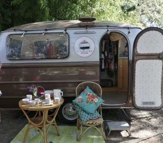 Je vends une caravane vintage Bourgeois B36 des années 60, modèle rare et entièrement habillée en aluminium. Elle a été professionnellement aménagée en boutique, avec espace expo/v