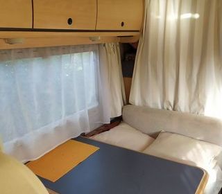 Fourgon aménagé 6 m de long marque allemande réputé équipé de lit jumeaux au sens de la marche très spacieux où l'on peut dormir à trois stores remis et occultant televo19 pouces