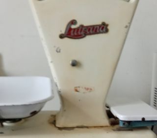 Balance de cuisine mécanique ancienne, marque Lusana, couleur crème, avec deux plateaux en métal, affichage du poids sur cadran gradué.