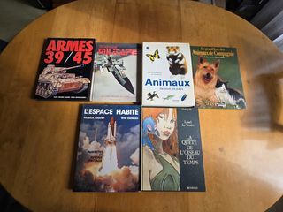 Lot de livres variés sur différents thèmes, incluant la technologie militaire, l'histoire de l'armement, la faune, les voyages dans l'espace et les bandes dessinées. Les livres son
