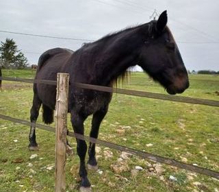 Cette belle jument, réformée des courses, est la fille d'Onyx du Goutier et de Gazelle Mesloise. Pré-débourrée, elle est calme et volontaire. Respectueuse, les contacts, soins, so
