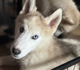 Adorable chiot type Husky Sibérien, né le 2 septembre 2025, au regard très expressif avec yeux bleus Origines : ? Père : Husky LOF ? Mère : Husky non LOF Il est élevé dans