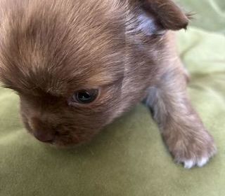 À réserver pour mi-décembre à mâle chihuahua poil long de couleur bringé masque Un mâle de couleur blanc avec des taches marron couleur des yeux bleus Ils seront pucés vacciner