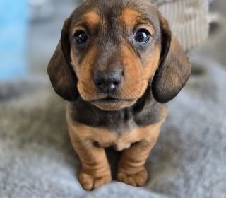 Disponibles pour réservation : deux chiots teckels nains à poils ras, LOF, nés le 3 mars 2026, disponibles début mai. Une femelle fauve charbonnée à 2000 € et un mâle fauve charbo