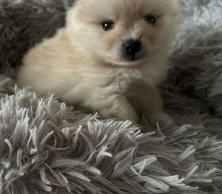 Petit Spitz nain Pomeranian nés le 24/11/25 de couleur crème light et sable, pelage dense, museau court. Élevés dans le domicile familiale, habitués aux enfants, aux chats, aux br